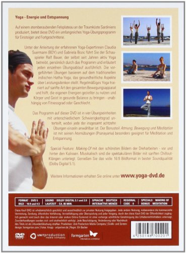 85 Min-DVD Auf einem einzigartigen Felsplateau an der Traumküste Sardiniens bietet diese DVD ein umfangreiches Yoga-Übungsprogramm für Einsteiger und Fortgeschrittene. Unter der Anleitung der erfahrenen Yoga-Expertinnen Claudia Suermann (BDY) und Gabriela Bozic führt der Schauspieler Ralf Bauer, der selbst seit Jahren aktiv Yoga betreibt, persönlich durch das Programm und erläutert jeden einzelnen Übungsablauf ausführlich. Die vorgeführten Übungen basieren auf dem traditionellen Hatha-Yoga, das gesundheitliche Aspekte über Leistungsdenken stellt. Regelmäßiges Yoga trainiert auf sanfte Art den gesamten Bewegungsapparat und hilft, die eigenen Energien gezielter zu nutzen und Körper und Geist in gesunde Balance zu bringen – unabhängig von Fitnessgrad oder Geschlecht. Das Programm auf dieser DVD ist in vier Übungseinheiten mit unterschiedlichem Schwierigkeitsgrad unterteilt, wobei jede der insgesamt achtzehn Übungen einzeln anwählbar ist. Der Bonusteil Atmung, Bewegung und Meditation ist mit seinen Atemübungen (Pranayama) besonders geeignet für Meditation und Entspannung. Special Feature: Making-Of mit den schönsten Bildern der Dreharbeiten – vor und hinter den Kulissen. Musikalisch sind die spektakulären Bilder mit sanften Chillout-Klängen unterlegt. Genießt das volle 16:9 Bildformat in bester Soundqualität (Dolby Digital 5.1)!