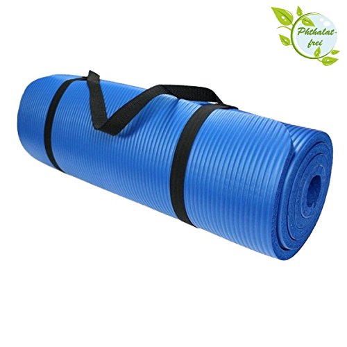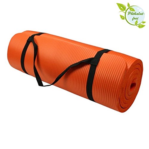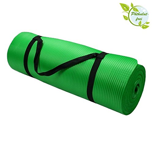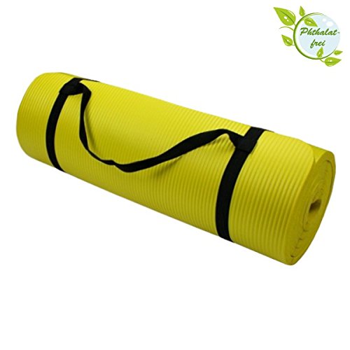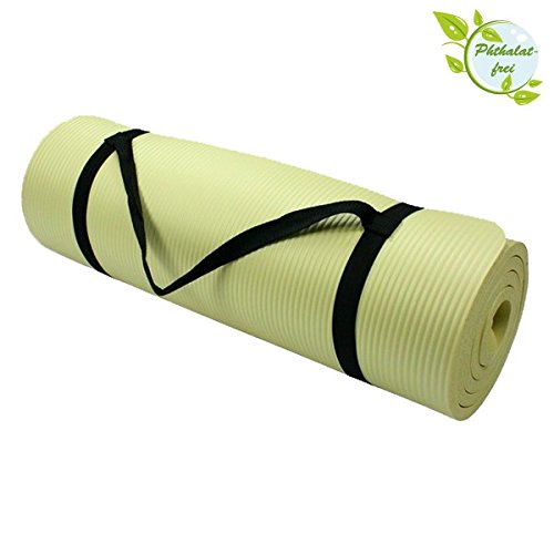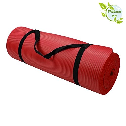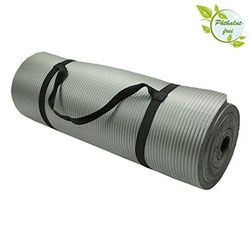 Yogamatte in vielen verschiedenen Größen und FarbenPHTHALATFREIYoga ist Entspannungstechnik Nr. 1. Sie ist eine der beliebtesten Sportarten unserer Zeit. Der Begriff „Yoga“ stammt aus dem Indischen und bedeutet „Einheit und Harmonie“. Yoga beeinflusst die Harmonisierung von Körper, Geist und Seele und sorgt für mehr Lebensqualität, Ausgeglichenheit und Energie. Die Matte ist durch ihre Polsterung eine komfortable Unterlage sowohl für Anfänger, als auch für Fortgeschrittene. Durch die Ausstattung mit Anti-Rutsch-Boden bietet sie die entsprechende Sicherheit während der Übungen.Der hier verwendete Nitrilkautschuk ist ein synthetisch hergestellter Kautschuk und besitzt hohe Beständigkeit gegenüber Ölen, Fetten und Kohlenwasserstoffen und ist auch besonders gut für Menschen geeignet, die unter einer Latexallergie leiden, denn Naturkautschuk (indian. Träne des Baumes) wird üblicherweise aus Latex gewonnen. Der anfängliche Geruch, der an karamellisiertes Lakritz erinnert, verfliegt nach wenigen Tagen.Details:Material: extra weicher, hochwertiger rutsch- und abriebfester SchaumstoffAntibakteriell und antiallergischHautfreundlich, körperwärmend und wasserundurchlässigSehr hoher QualitätsstandardPlatzsparend zusammenrollbarFlexibel einsetzbar und jederzeit mitnehmbar durch Ausstattung mit elastischen Fixiergummi und TragebandLängen: 180 cm / 185 cm / 190 cm / 200 cmBreiten: 60 cm / 80 cm / 100 cmHöhe: 1.5 cmGewicht: 1300 g / 2150 g / 2150 g / 1850 gFarben: rot, gelb, beige, Balance Blue (blau), Charming Pink (pink), Combat Black (schwarz), Fresh Turquoise (türkis),Natural Green (grün), Power Red (rot), Sporty Orange (orange), Strong Silver (silbergrau), Vivid Violet (violett) Lieferumfang: Yogamatte, Tragebänder, deutsche Gebrauchsanweisung