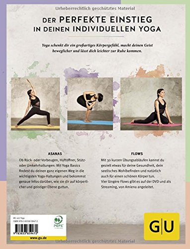 Yoga Basics vermittelt alles, was Yoga-Einsteiger wissen sollten – und dies auf sehr ansprechend gestaltete und zeitgemäße Weise. So wird die Yoga-Philosophie gleich auf den modernen Alltag bezogen. Was kann ich vom Yoga für meine Beziehungen zu anderen Menschen lernen, wie hilft mir der Yoga, besser mit Stress umzugehen? Um solche Themen geht es im Einführungskapitel und auch darum, dass jeder sein Yoga entsprechend seiner körperlichen Voraussetzungen praktizieren sollte. Im großen Asana-Kapitel werden die 30 wichtigsten Positionen anhand vieler Step-Fotos beschrieben – immer mit Hinweisen auf die Wirkung sowie auf individuelle Variationsmöglichkeiten. Für das Flow-Kapitel hat die Autorin die Asanas zu kurzen Bewegungsabläufen kombiniert, die das Üben dynamischer und abwechslungsreicher machen. Und mit der DVD kommt Amiena Zylla ins Wohnzimmer und leitet auf ihre unnachahmlich charmante Weise vier verschiedene Übungsprogamme an.