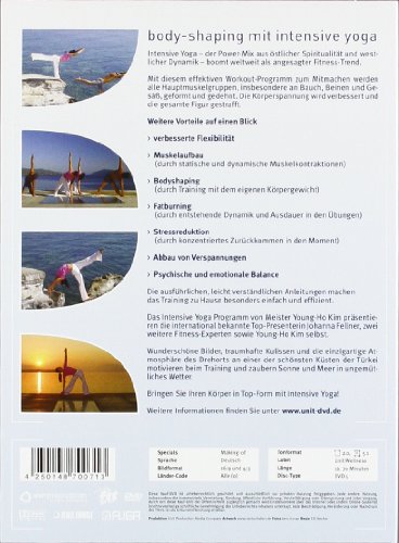 Young Ho Kim & Johanna Fellner Young Ho Kim & Johanna Fellner, DVD Laufzeit 70 min, Fitness, Wellness, 1 Disk, Version: Amaray, FSK o.A. erschienen am: 20.02.2006 Intensive Yoga – der Power-Mix aus östlicher Spiritualität und westlicher Dynamik – boomt weltweit als angesagter Fitness-Trend. Mit diesem effektiven Workout-Programm zum Mitmachen werden alle Hauptmuskelgruppen, insbesondere an Bauch, Beinen und Po wirksam geformt und gedehnt. Die Körperspannung wird verbessert und die gesamte Figur gestrafft. Weitere Vorteile auf einen Blick: – verbesserte Flexibilität – Muskelaufbau (durch statische und dynamische Muskelkontraktionen) – Bodyshaping (durch Training mit dem eigenen Körpergewicht) – Fatburning (durch entstehende Dynamik und Ausdauer in den Übungen) – Stressreduktion (durch konzentriertes Zurückkommen in den Moment) – Abbau von Verspannungen – Psychische und emotionale Balance Die ausführlichen, leicht verständlichen Anleitungen machen das Training zu Hause besonders einfach und effizient. Das Intensive Yoga Programm von Meister Young-Ho Kim präsentieren die international bekannte Top-Presenterin Johanna Fellner, zwei weiteren Fitness-Experten sowie Young-Ho Kim selbst. Wunderschöne Bilder, traumhafte Kulissen und die einzigartige Atmosphäre des Drehorts an einer der schönsten Küsten der Türkei motivieren beim Training und zaubern Sonne und Meer in ungemütliches Wetter. Bringen Sie Ihren Körper in Top-Form mit Intensive Yoga! Schlagworte: DVD Spielfilm Unterhaltungsfilm Fitness, Wellness