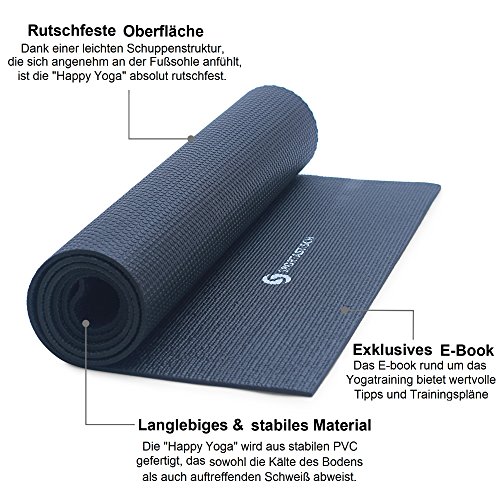 Yoga verhilft sowohl dem Körper als auch der Seele im hektischen Alltag, den heute jeden zweiten plagt, zu Ruhe und Balance. Damit Sie perfekt ausgestattet sind und Ihre Yoga Session durch nichts gestört wird, haben wir für Sie unsere innovative „Happy Yoga“ Yogamatte. In unserem Set erhalten Sie: 1 PREMIUM „Happy Yoga“ Yogamatte MEMORY EFFEKT Material Exklusives E-Book rund um das Yogatraining 3 Jahre Premium Garantie Die „Happy Yoga“ Yogamatte ist im schlichten und eleganten Schwarz gehalten, das nie aus der Mode kommt. Das Schwarz hilft außerdem bei der Konzentrationsfindung. Denn es dämpft die Energien, die für Karriere und ähnlich stressige Dinge verbraucht werden, sodass Sie sich nur noch auf sich selbst konzentrieren können. Wir verwenden zudem nicht nur modernste Materialien, sondern sorgen für absolute Rutschfestigkeit, als auch für eine optimale Weichheit, ohne dass Sie in der Matte einsinken. Ihre Vorteile: Hochwertiges, weiches Material Zeitloses Design Absolute Rutschfestigkeit Extra breite Abmessungen Hinweis: Ein leichter Geruch des Herstellungsverfahrens ist mit einigen Handwäschen verschwunden, dies ist normal und dauert nicht an. Rechtliche Hinweise: Garantiebestimmungen und weitere Informationen zur Sportastisch Premium 3 Jahre Produktgarantie finden Sie unter garantie.sportastisch.com.