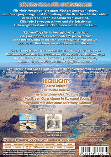 Canda Canda, DVD Laufzeit 65 min, Fitness, 1 Disk, Version: Amaray, FSK Info erschienen am: 22.02.2013 Für viele Menschen, die unter Rückenschmerzen leiden, sind Bewegungsmangel und Fehlhaltungen die Ursachen für ihr Leiden. Doch gerade, wenn die Schmerzen akut sind, fällt jede Bewegung schwer und die Spirale von Unbeweglichkeit und Rückenleiden nimmt seinen Lauf. Rücken-Yoga für Unbewegliche ist deshalb ein ganz besonders schonendes Yogaprogramm! Die sanften Übungen lockern die verspannte Muskulatur, lindern die Beschwerden und stärken den Rücken. Und, da negativer Stress ebenfalls eine häufige Ursache von Rückenbeschwerden ist, profitieren Sie doppelt von Rücken-Yoga: Durch die entspannende Wirkung auf Körper und Geist, nehmen Sie dem Rückenschmerz jegliche Chance! Genießen Sie mit Canda und wunderschönen Aufnahmen aus dem Grand Canyon das wohltuende Schonprogramm für die Wirbelsäule!Schlagworte: DVD Spielfilm Unterhaltungsfilm Fitness