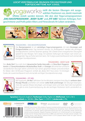 DVD“Yogaworks – Der Yoga-Dreierpack“ stellt die besten Yoga-Übungen mit ausgewählten Positionen vor, damit maximale Effekte für Gesundheit, Beweglichkeit, Kraft und Entspannung erzielt werden können. Dabei eignen sich die Yoga-Programme sowohl für Anfänger, Fortgeschrittene und Profis, jeden Alters und Fitnesslevels. Die Übungen beanspruchen den ganzen Körper, beruhigen und reinigen Geist und Seele.Der Yoga-Dreierpack enthält folgende Programme:? Yogaworks – Das Basisprogramm (ca. 80 Min.)? Yogaworks – Body Slim (ca. 50 Min. + 15 Min. Guide)? Yogaworks – Fit Abs (ca. 50 Min. + 15 Min. Guide)